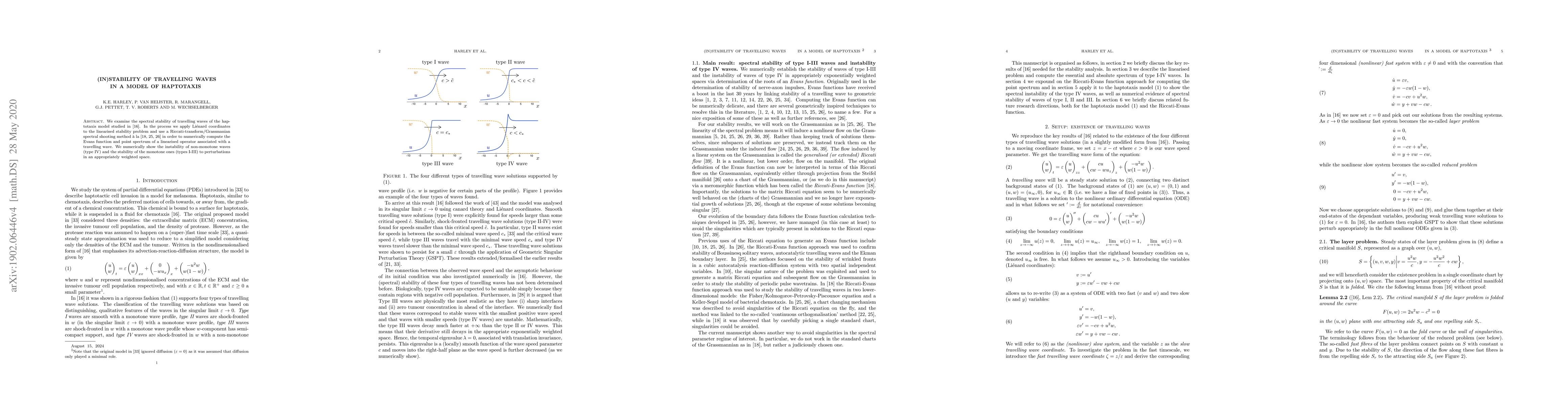 Researchers studied the stability of traveling waves in a model of haptotaxis, finding that non-monotone waves are unstable while monotone ones remain stable to perturbations.