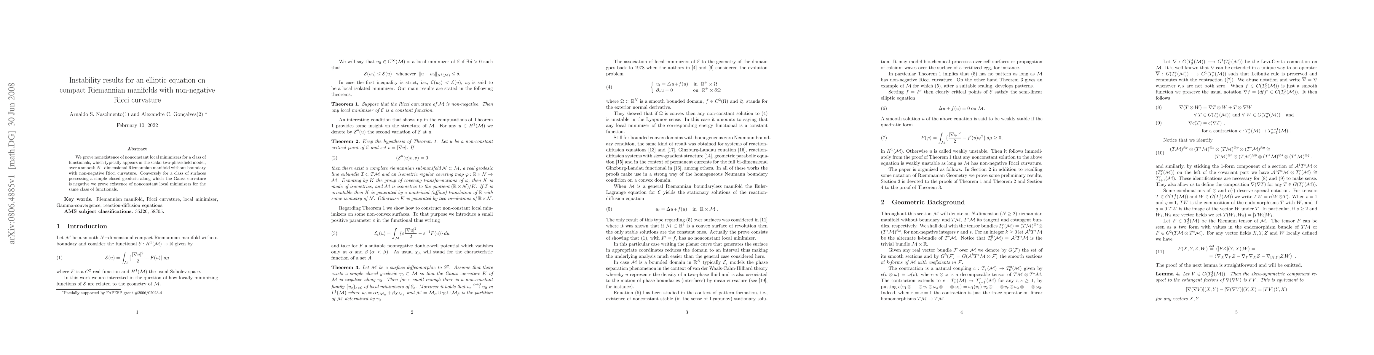 We prove nonexistence of nonconstant local minimizers for a class of functionals, which typically appears in the scalar two-phase field model, over a smooth N-dimensional Riemannian manifold without boundary with non-negative Ricci curvature. Conversely for a class of surfaces possessing a simple closed geodesic along which the Gauss curvature is negative we prove existence of nonconstant local minimizers for the same class of functionals.