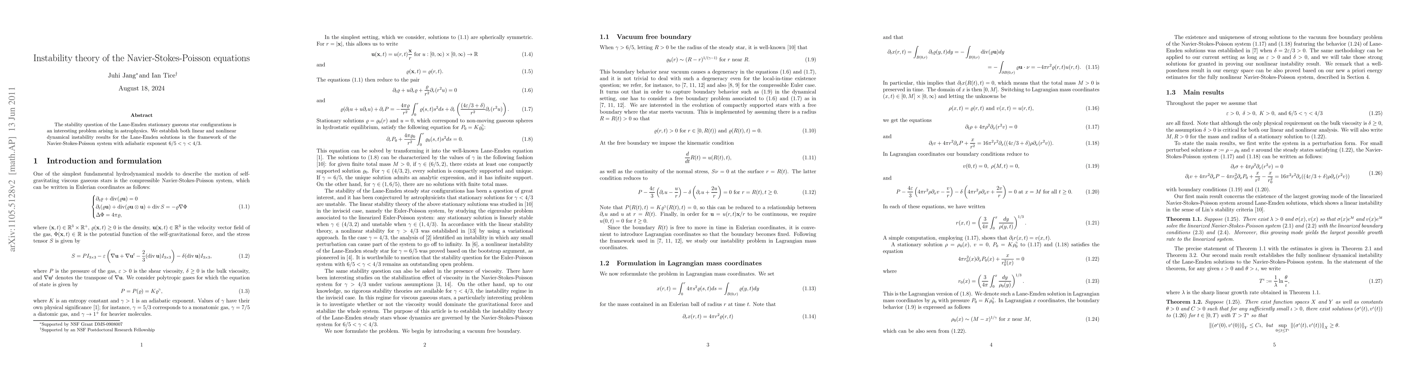 This paper investigates the dynamical instability of Lane-Emden solutions for gaseous star configurations within the Navier-Stokes-Poisson system, establishing both linear and nonlinear instability results for configurations with an adiabatic exponent between $6/5$ and $4/3$.
