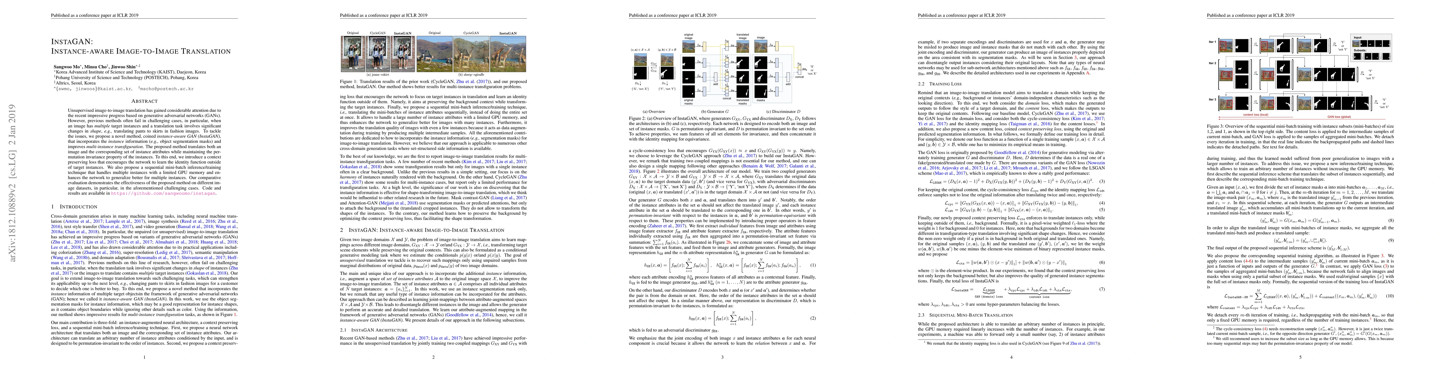 InstaGAN is a novel instance-aware GAN method for unsupervised image-to-image translation that incorporates object segmentation masks to handle multi-instance transfiguration, especially in complex shape changes. It employs a context preserving loss and a sequential mini-batch technique for better generalization and memory efficiency.