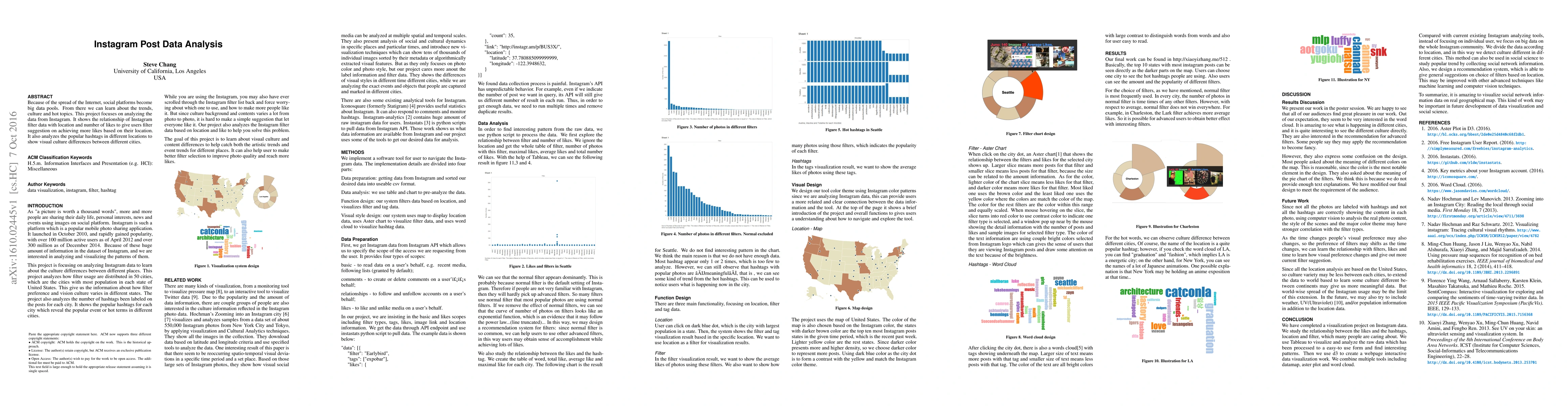 Because of the spread of the Internet, social platforms become big data pools. From there we can learn about the trends, culture and hot topics. This project focuses on analyzing the data from Instagram. It shows the relationship of Instagram filter data with location and number of likes to give users filter suggestion on achieving more likes based on their location. It also analyzes the popular hashtags in different locations to show visual culture differences between different cities.