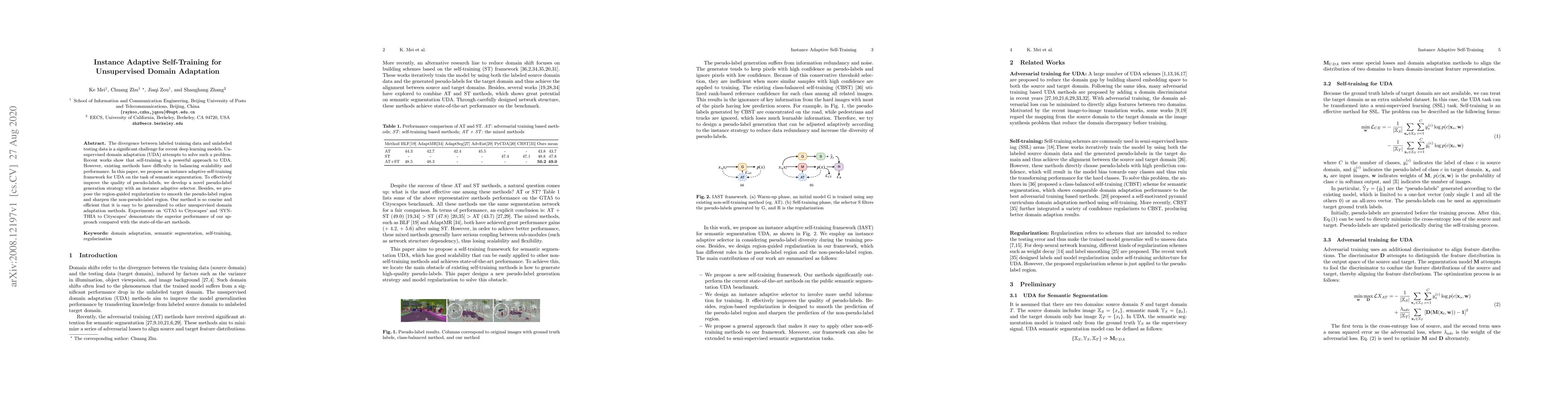 This paper proposes an instance adaptive self-training framework for unsupervised domain adaptation in semantic segmentation, featuring a novel pseudo-label generation strategy and region-guided regularization. The method demonstrates superior performance over state-of-the-art approaches in domain adaptation tasks.