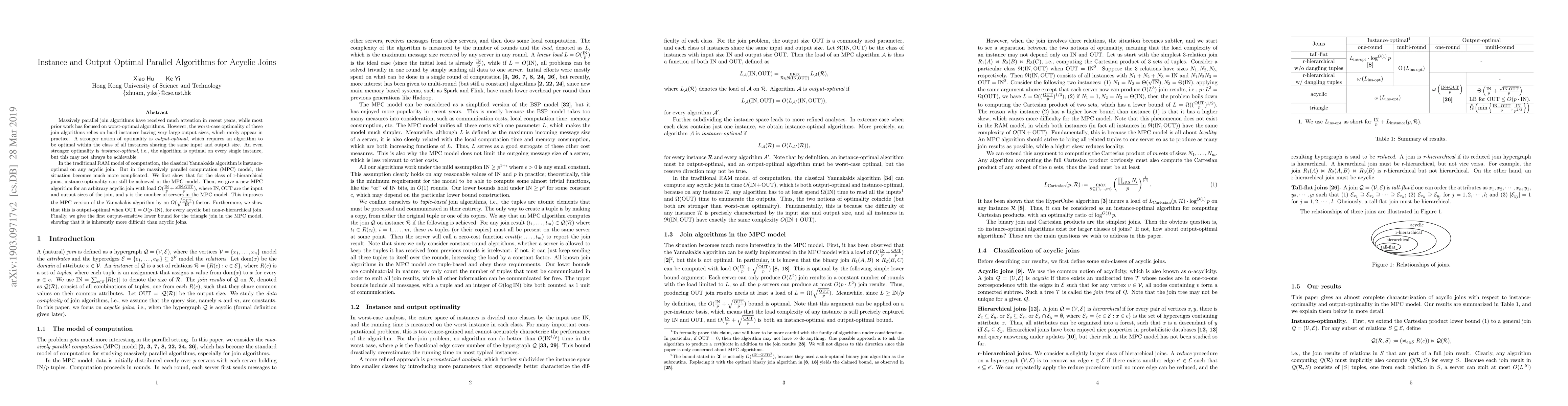 This paper presents new parallel algorithms for acyclic joins in the massively parallel computation (MPC) model, achieving both instance-optimal and output-optimal performance. It improves upon the Yannakakis algorithm by optimizing load and provides the first output-sensitive lower bound for triangle joins, demonstrating their inherent complexity.