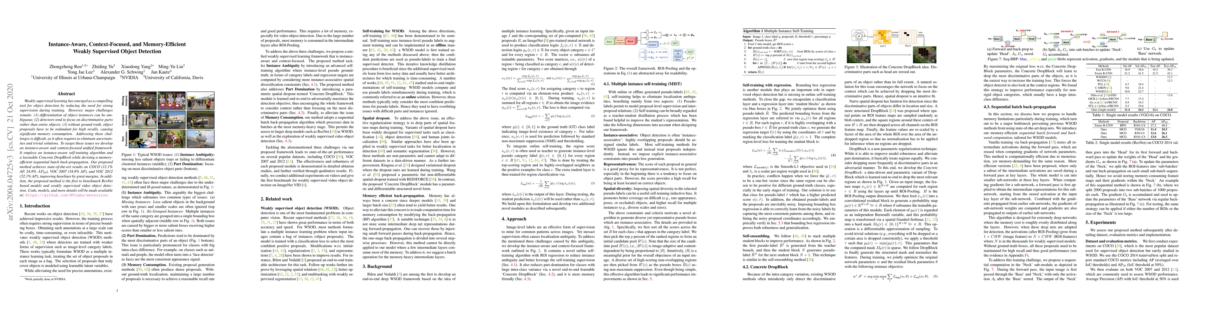 This paper proposes an instance-aware, context-focused framework for weakly supervised object detection that addresses ambiguities in instance differentiation, focuses on entire objects, and minimizes memory usage. The method achieves state-of-the-art results on COCO, VOC 2007, and VOC 2012 datasets, and introduces a benchmark for ResNet-based models in weakly supervised video object detection.