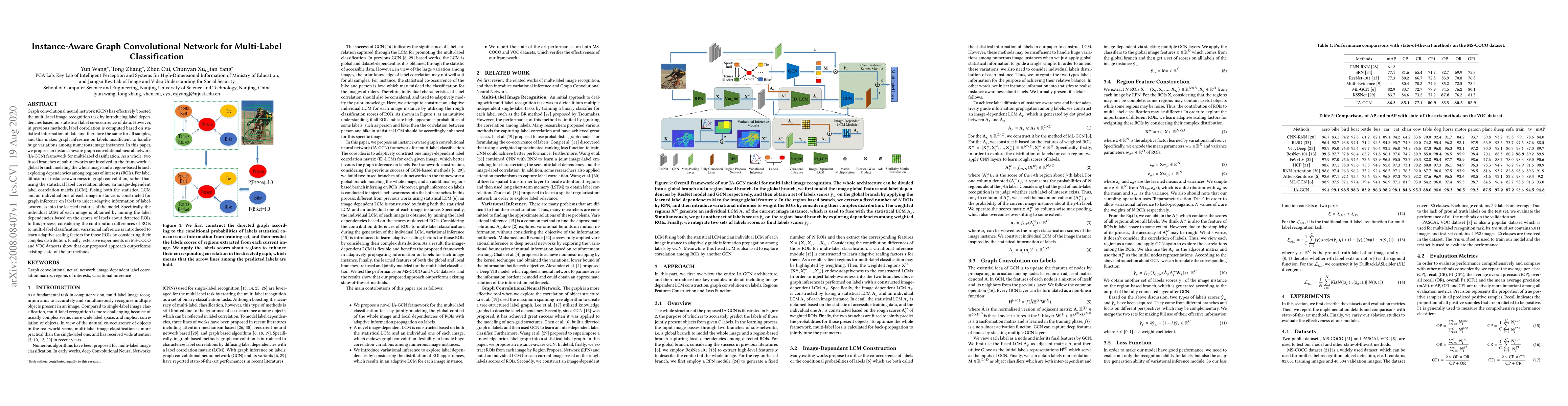 This paper introduces an instance-aware graph convolutional network (IA-GCN) for multi-label classification, combining global and region-based branches to model entire images and specific regions of interest (ROIs). It constructs an image-dependent label correlation matrix, integrating statistical and individual label correlations, to improve label diffusion and outperform existing methods on MS-COCO and VOC datasets.