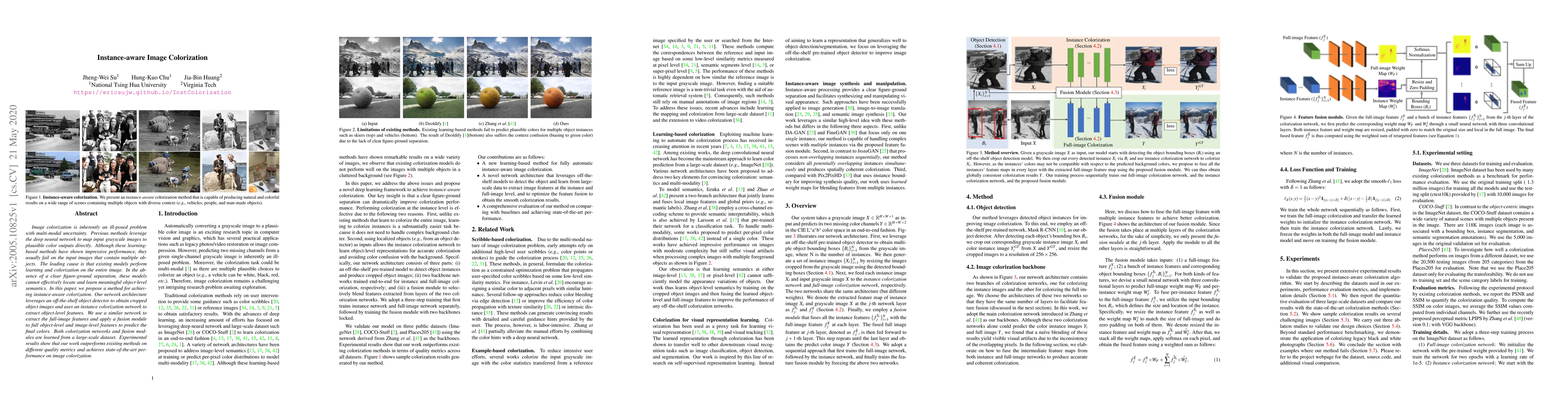 This paper proposes an instance-aware image colorization method that uses an object detector to crop objects and an instance colorization network to extract object-level features, achieving state-of-the-art performance by fusing object-level and full-image features for color prediction.