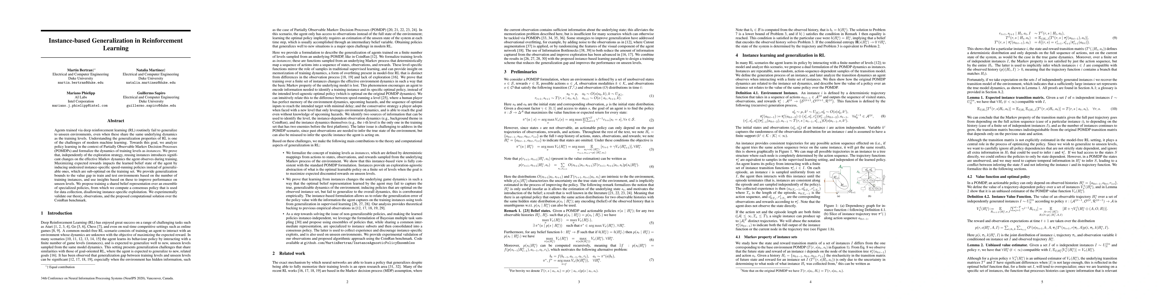 Agents trained via deep reinforcement learning (RL) routinely fail to generalize to unseen environments, even when these share the same underlying dynamics as the training levels. Understanding the generalization properties of RL is one of the challenges of modern machine learning. Towards this goal, we analyze policy learning in the context of Partially Observable Markov Decision Processes (POMDPs) and formalize the dynamics of training levels as instances. We prove that, independently of the exploration strategy, reusing instances introduces significant changes on the effective Markov dynamics the agent observes during training. Maximizing expected rewards impacts the learned belief state of the agent by inducing undesired instance specific speedrunning policies instead of generalizeable ones, which are suboptimal on the training set. We provide generalization bounds to the value gap in train and test environments based on the number of training instances, and use insights based on these to improve performance on unseen levels. We propose training a shared belief representation over an ensemble of specialized policies, from which we compute a consensus policy that is used for data collection, disallowing instance specific exploitation. We experimentally validate our theory, observations, and the proposed computational solution over the CoinRun benchmark.