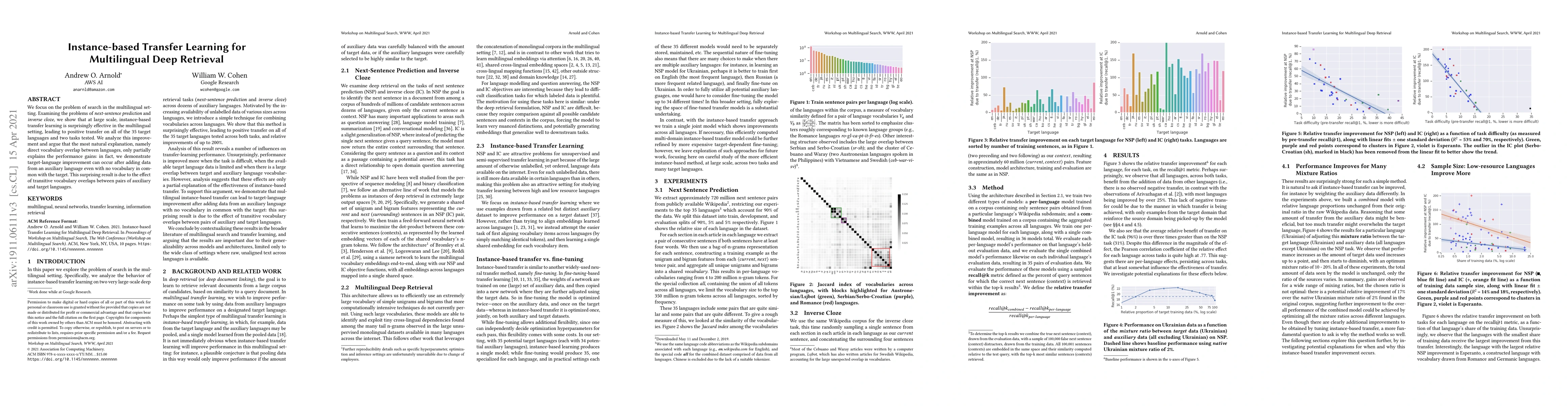 We focus on the problem of search in the multilingual setting. Examining the problems of next-sentence prediction and inverse cloze, we show that at large scale, instance-based transfer learning is surprisingly effective in the multilingual setting, leading to positive transfer on all of the 35 target languages and two tasks tested. We analyze this improvement and argue that the most natural explanation, namely direct vocabulary overlap between languages, only partially explains the performance gains: in fact, we demonstrate target-language improvement can occur after adding data from an auxiliary language even with no vocabulary in common with the target. This surprising result is due to the effect of transitive vocabulary overlaps between pairs of auxiliary and target languages.