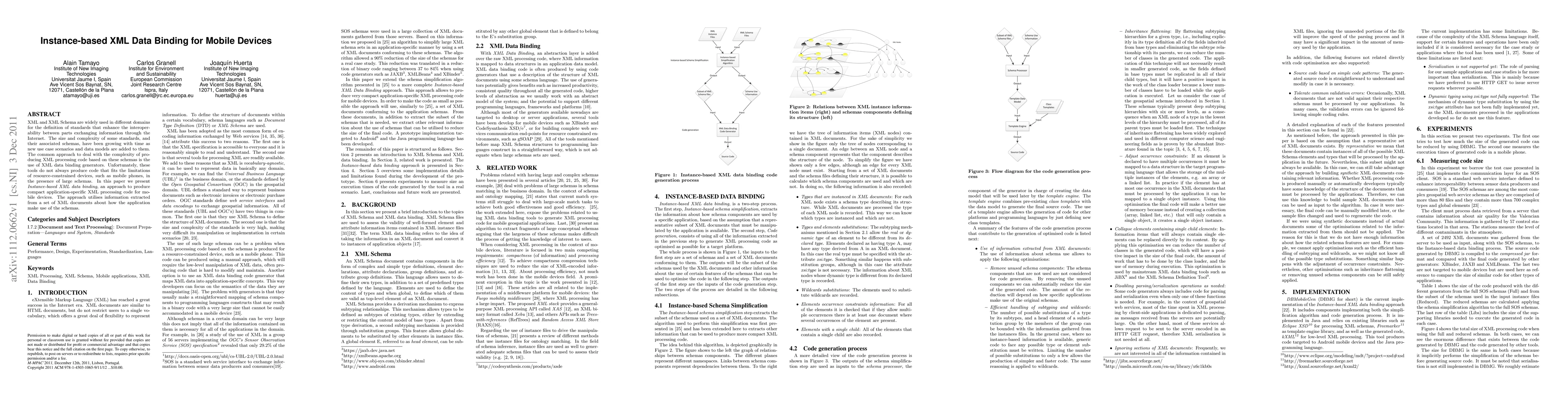 This paper introduces an instance-based XML data binding method to generate compact, application-specific XML processing code for mobile devices, addressing the limitations of traditional XML data binding generators in resource-constrained environments. The approach leverages information from XML documents to optimize code for specific use cases.