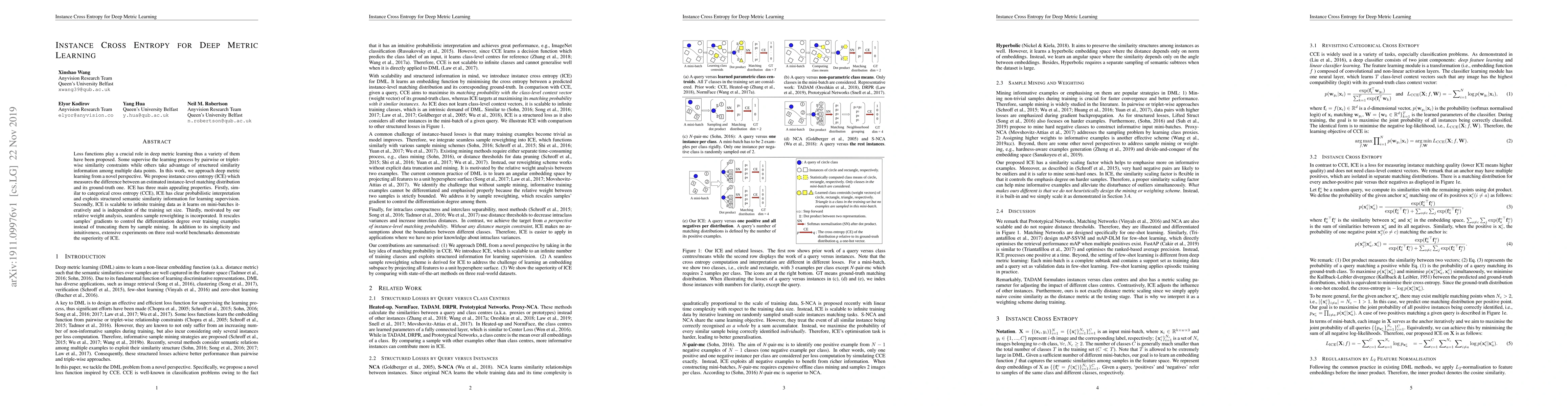 This paper proposes instance cross entropy (ICE) as a novel loss function for deep metric learning, emphasizing its probabilistic interpretation, scalability to infinite data, and seamless sample reweighting. Experiments show ICE's effectiveness over existing methods on multiple benchmarks.