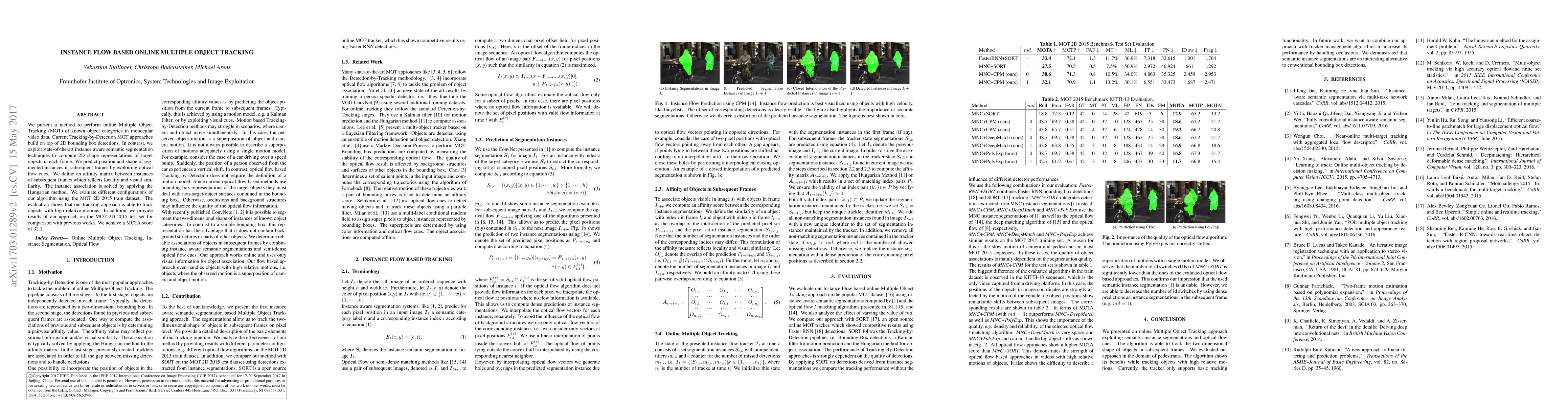 We present a method to perform online Multiple Object Tracking (MOT) of known object categories in monocular video data. Current Tracking-by-Detection MOT approaches build on top of 2D bounding box detections. In contrast, we exploit state-of-the-art instance aware semantic segmentation techniques to compute 2D shape representations of target objects in each frame. We predict position and shape of segmented instances in subsequent frames by exploiting optical flow cues. We define an affinity matrix between instances of subsequent frames which reflects locality and visual similarity. The instance association is solved by applying the Hungarian method. We evaluate different configurations of our algorithm using the MOT 2D 2015 train dataset. The evaluation shows that our tracking approach is able to track objects with high relative motions. In addition, we provide results of our approach on the MOT 2D 2015 test set for comparison with previous works. We achieve a MOTA score of 32.1.