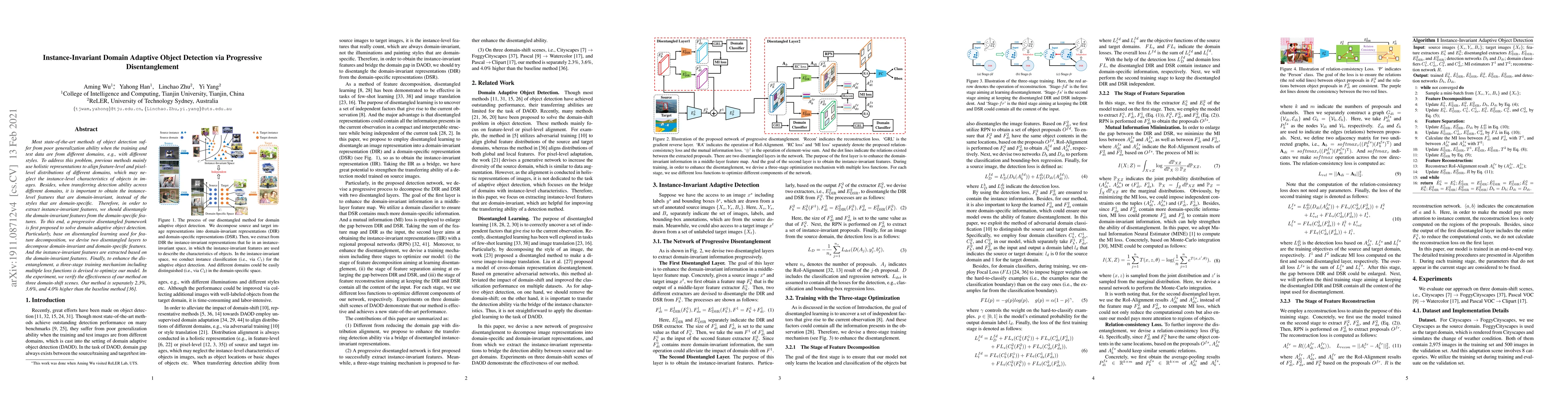 This paper proposes a progressive disentangled framework for instance-invariant domain adaptive object detection, utilizing disentangled learning to separate domain-invariant features from domain-specific styles. The method achieves better generalization across different domains compared to baseline methods, with improvements of 2.3%, 3.6%, and 4.0% in three domain-shift scenarios.