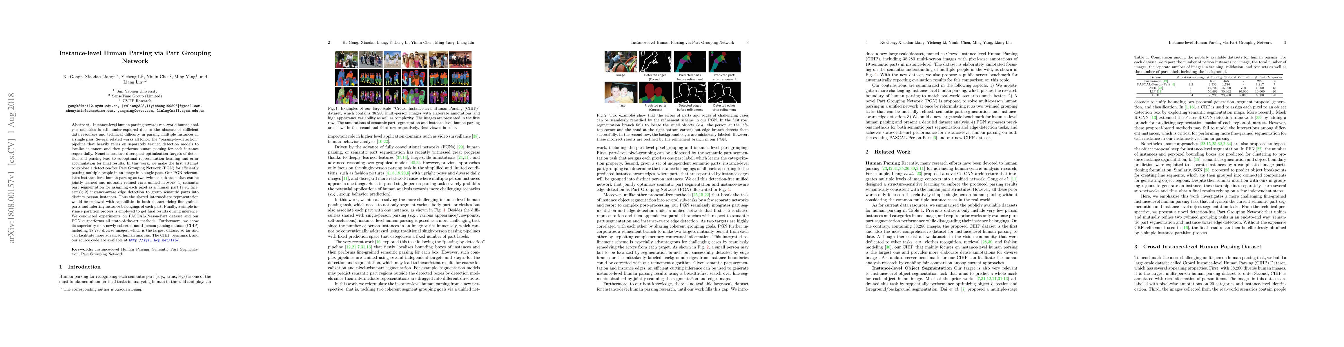 This paper proposes a Part Grouping Network (PGN) for instance-level human parsing without relying on detection models, achieving efficient parsing of multiple people in a single pass. The PGN jointly learns semantic part segmentation and instance-aware edge detection, leading to improved performance over existing methods on datasets like PASCAL-Person-Part and the newly introduced CIHP dataset.