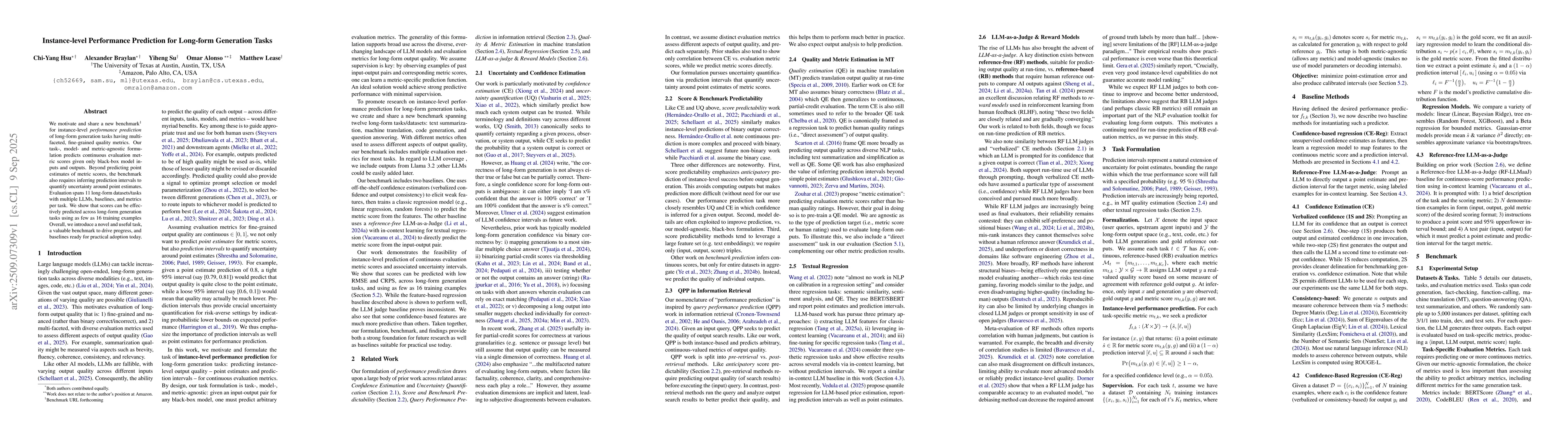 We motivate and share a new benchmark for instance-level performance prediction of long-form generation tasks having multi-faceted, fine-grained quality metrics. Our task-, model- and metric-agnostic formulation predicts continuous evaluation metric scores given only black-box model inputs and outputs. Beyond predicting point estimates of metric scores, the benchmark also requires inferring prediction intervals to quantify uncertainty around point estimates. Evaluation spans 11 long-form datasets/tasks with multiple LLMs, baselines, and metrics per task. We show that scores can be effectively predicted across long-form generation tasks using as few as 16 training examples. Overall, we introduce a novel and useful task, a valuable benchmark to drive progress, and baselines ready for practical adoption today.