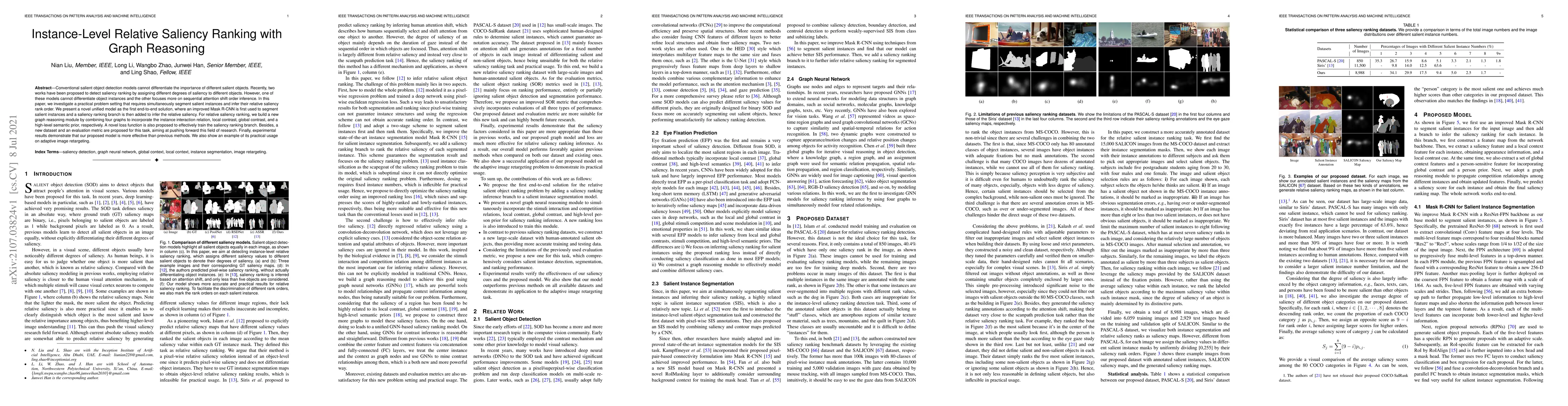 This paper proposes a novel end-to-end model for segmenting salient object instances and ranking their relative saliency using graph reasoning. The model integrates an improved Mask R-CNN for instance segmentation and a saliency ranking branch with a new graph reasoning module to capture instance interactions and contextual contrasts.