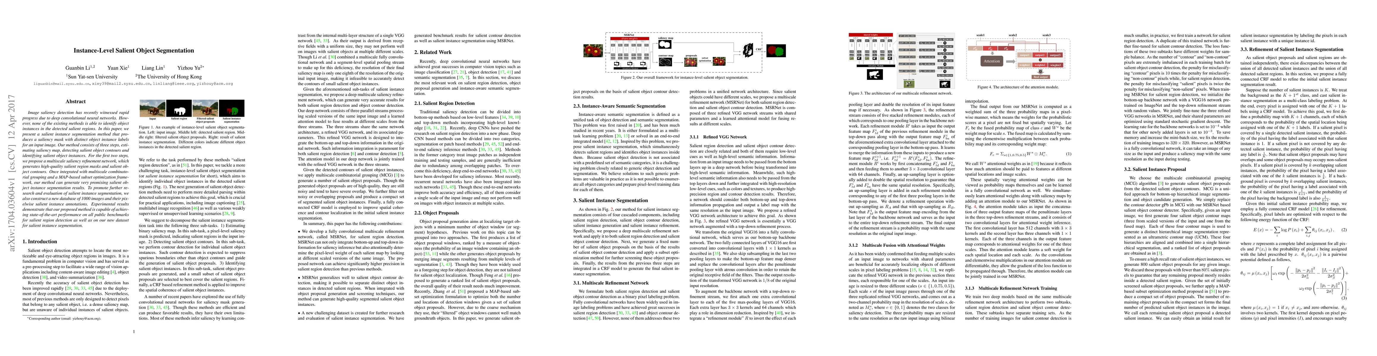 This paper introduces a novel method for instance-level salient object segmentation using deep convolutional neural networks, achieving state-of-the-art performance on public benchmarks and a newly constructed dataset. The method involves saliency map estimation, salient object contour detection, and instance identification, employing a multiscale saliency refinement network and combinatorial grouping.