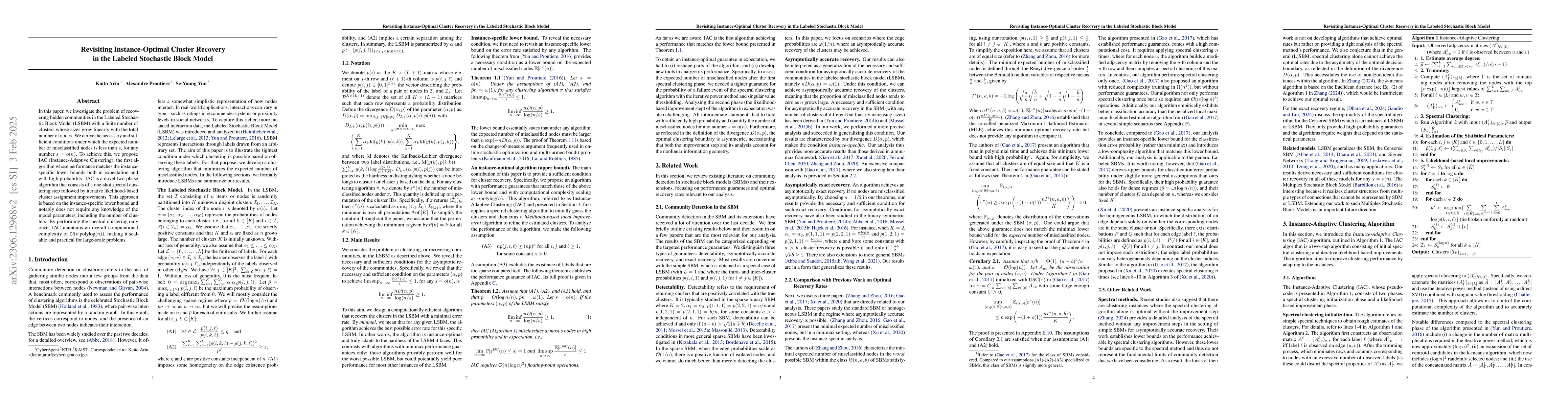 This paper proposes an Instance-Adaptive Clustering (IAC) algorithm for recovering hidden communities in the Labeled Stochastic Block Model, achieving optimal performance by matching instance-specific lower bounds. IAC combines spectral clustering with iterative refinement, maintaining a computational complexity of $\mathcal{O}(n \text{polylog}(n))$ and requiring no model parameters.