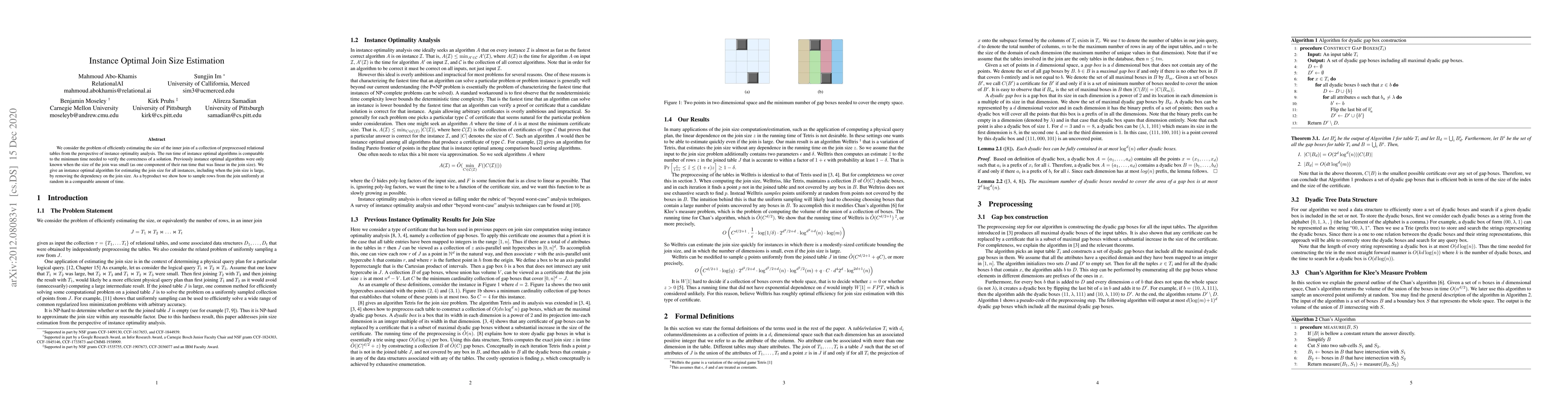 This paper presents an instance optimal algorithm for estimating the size of inner joins in relational tables, eliminating the dependency on join size for efficiency. It also demonstrates how to uniformly sample rows from the join in a comparable time frame.