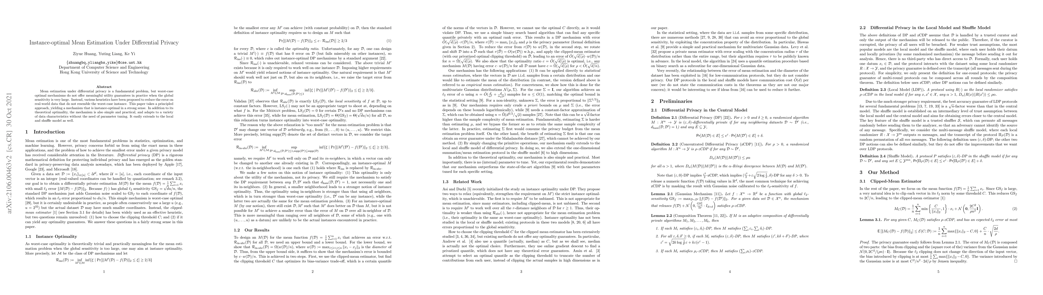 This paper proposes an instance-optimal mechanism for mean estimation under differential privacy, which provides strong theoretical guarantees and practical utility, adapting to diverse data characteristics without parameter tuning. It extends to the local and shuffle models effectively.