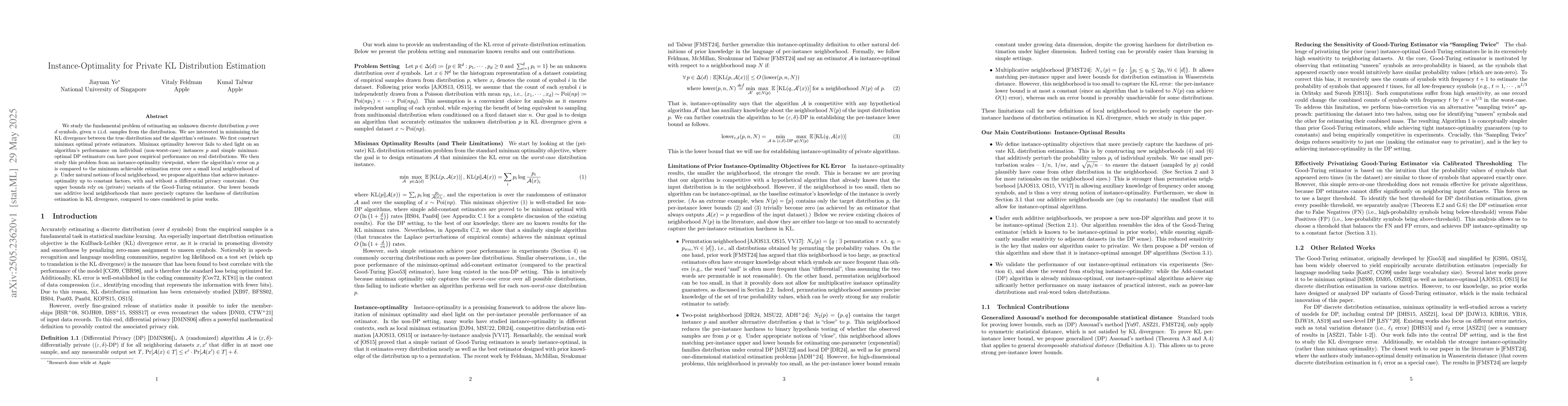 The paper presents novel instance-optimal algorithms for private KL distribution estimation, utilizing private Good-Turing estimators and additive local neighborhoods for bounds.