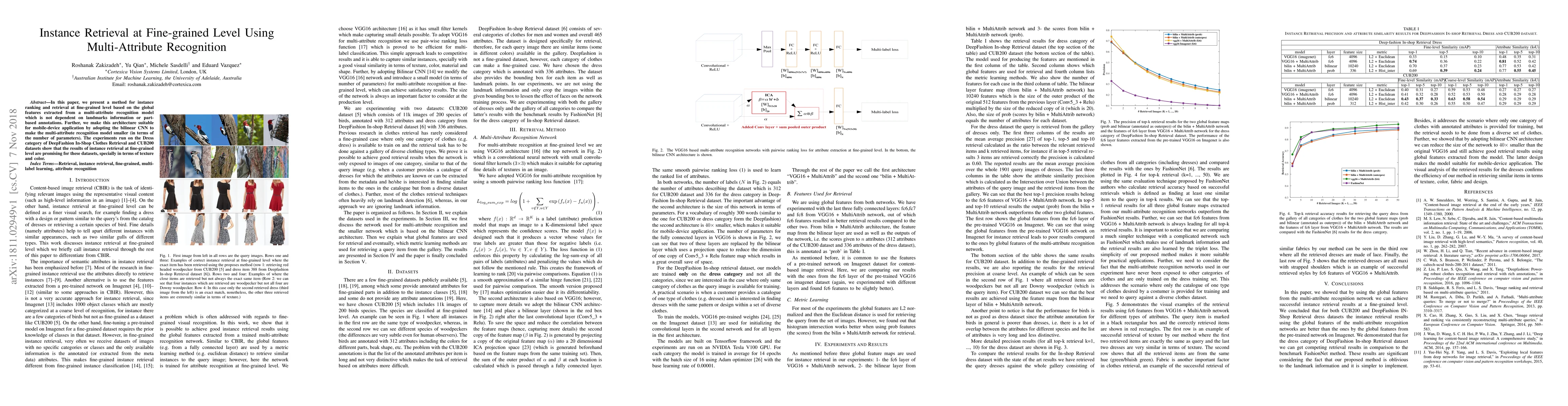 This paper proposes a method for fine-grained instance retrieval based on global features from a multi-attribute recognition model, utilizing bilinear CNNs to reduce model size for mobile applications. Experiments on the Dress category and CUB200 datasets show promising results, especially in texture and color recognition.