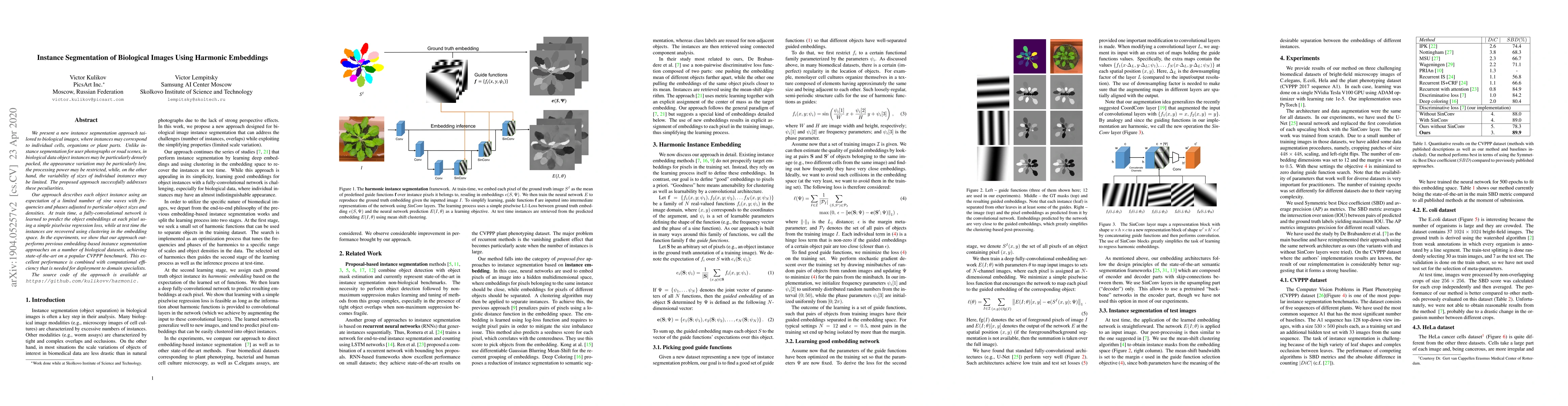 This paper introduces a novel instance segmentation method for biological images using harmonic embeddings, which effectively handles densely packed, low-appearance variation objects. The method employs a fully-convolutional network to predict sine wave embeddings for each object instance, followed by clustering for instance recovery, achieving state-of-the-art performance on biological datasets.