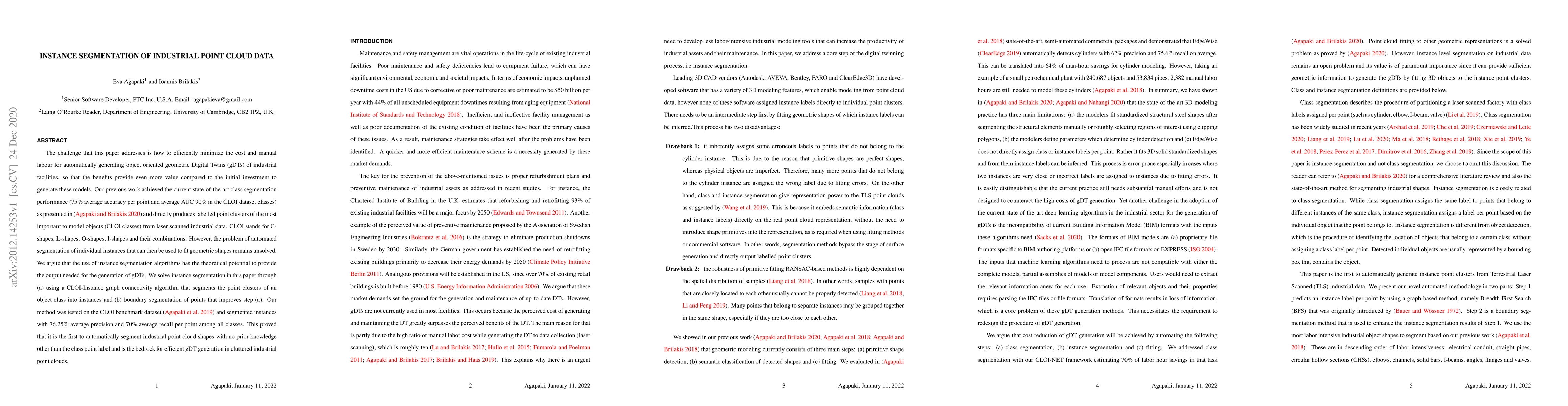 This paper presents an innovative method for instance segmentation of industrial point cloud data to minimize costs and manual labor in generating Digital Twins. It introduces a CLOI-Instance graph connectivity algorithm and boundary segmentation to achieve 76.25% average precision and 70% average recall, marking the first fully automatic instance segmentation in industrial point clouds.