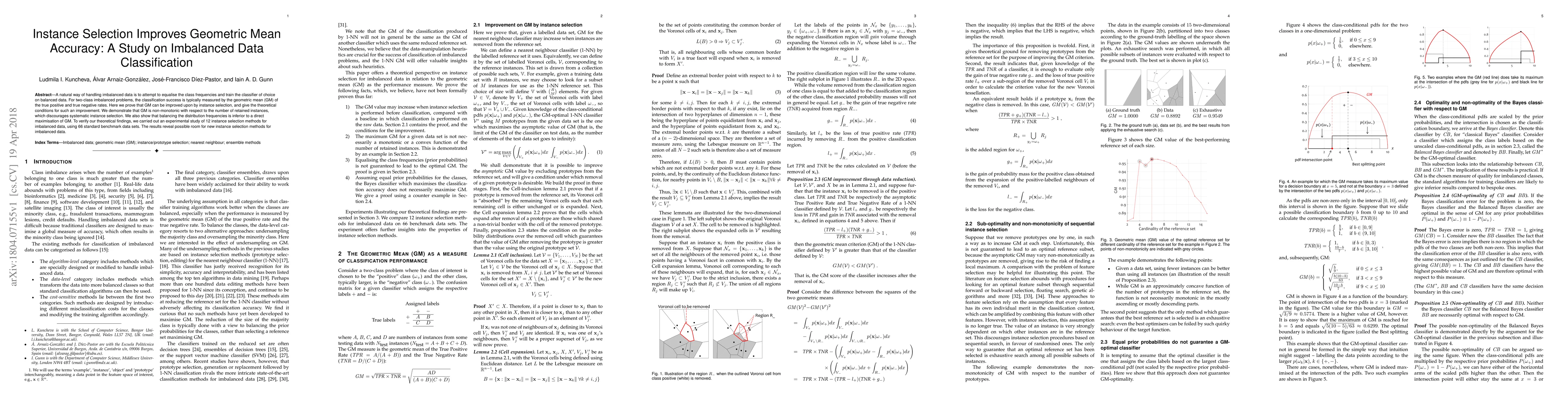 This paper demonstrates that instance selection can improve the geometric mean accuracy in imbalanced data classification, showing that balancing class frequencies is not always optimal. Experimental results on 66 datasets suggest potential for new instance selection methods to enhance GM accuracy.