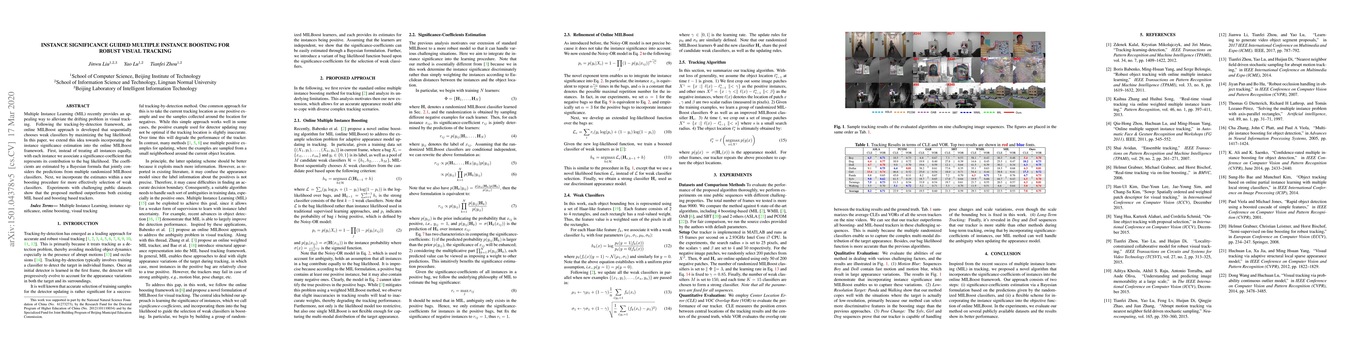 This paper proposes an enhanced Multiple Instance Boosting (MILBoost) approach for visual tracking that incorporates instance significance estimation. It assigns significance coefficients to instances based on their contributions to the bag likelihood, improving the selection of weak classifiers and outperforming existing MIL and boosting-based trackers on challenging datasets.