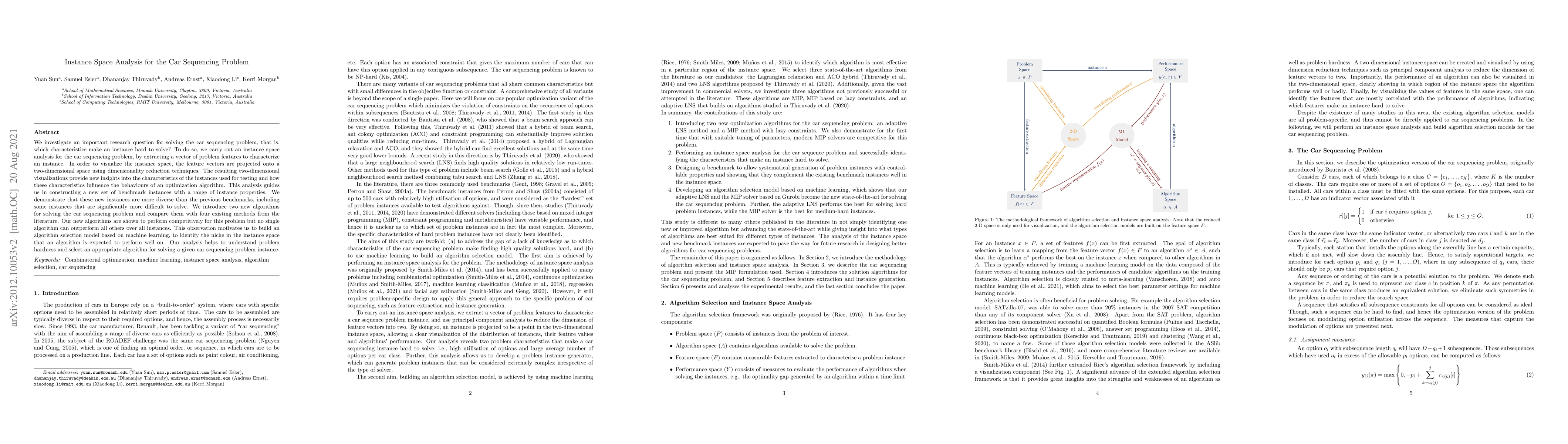 This study analyzes the characteristics of instances in the car sequencing problem to identify key features that make an instance hard to solve, and introduces two new algorithms and a machine learning-based algorithm selection model.