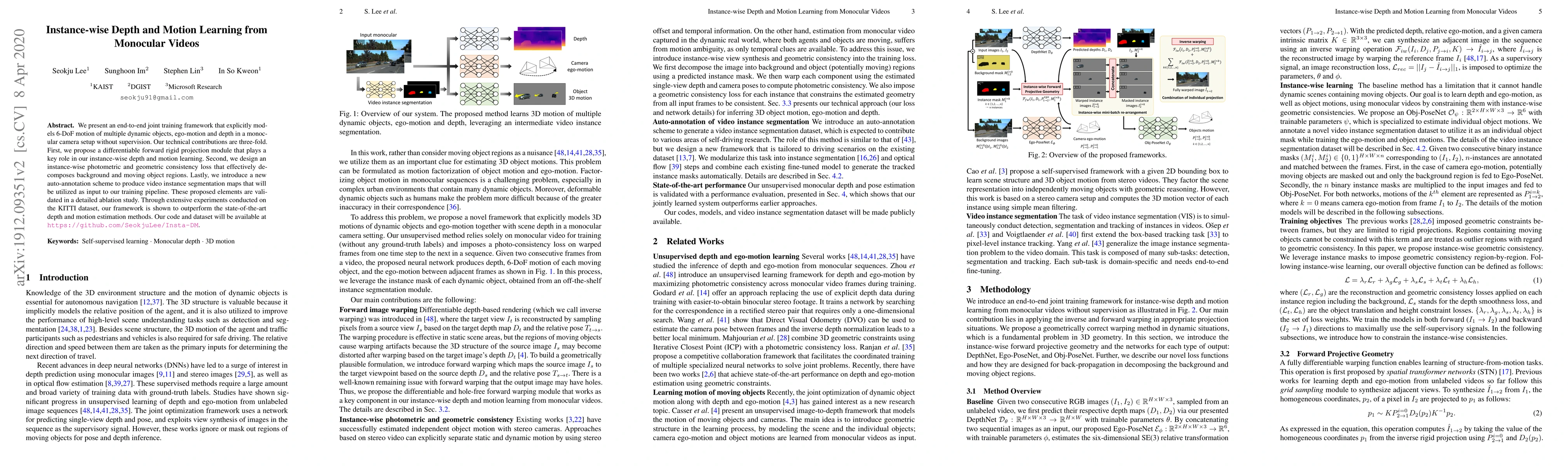 This paper introduces an end-to-end framework for learning depth and 6-DoF motion of dynamic objects from monocular videos without supervision. It employs a differentiable projection module, an instance-wise consistency loss, and an auto-annotation scheme, achieving state-of-the-art performance on the KITTI dataset.