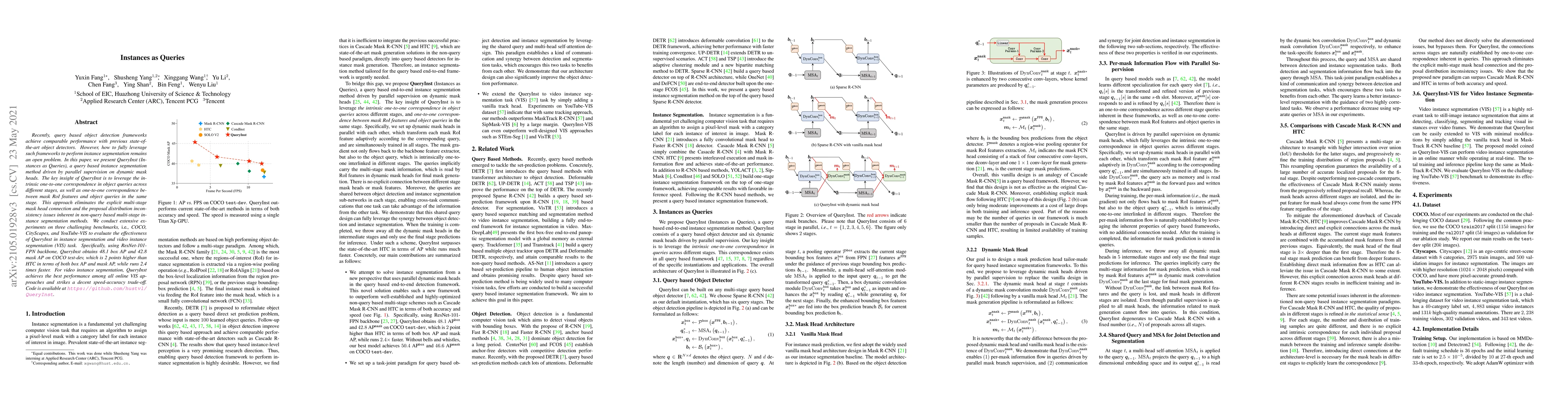 Recently, query based object detection frameworks achieve comparable performance with previous state-of-the-art object detectors. However, how to fully leverage such frameworks to perform instance segmentation remains an open problem. In this paper, we present QueryInst (Instances as Queries), a query based instance segmentation method driven by parallel supervision on dynamic mask heads. The key insight of QueryInst is to leverage the intrinsic one-to-one correspondence in object queries across different stages, as well as one-to-one correspondence between mask RoI features and object queries in the same stage. This approach eliminates the explicit multi-stage mask head connection and the proposal distribution inconsistency issues inherent in non-query based multi-stage instance segmentation methods. We conduct extensive experiments on three challenging benchmarks, i.e., COCO, CityScapes, and YouTube-VIS to evaluate the effectiveness of QueryInst in instance segmentation and video instance segmentation (VIS) task. Specifically, using ResNet-101-FPN backbone, QueryInst obtains 48.1 box AP and 42.8 mask AP on COCO test-dev, which is 2 points higher than HTC in terms of both box AP and mask AP, while runs 2.4 times faster. For video instance segmentation, QueryInst achieves the best performance among all online VIS approaches and strikes a decent speed-accuracy trade-off. Code is available at \url{https://github.com/hustvl/QueryInst}.