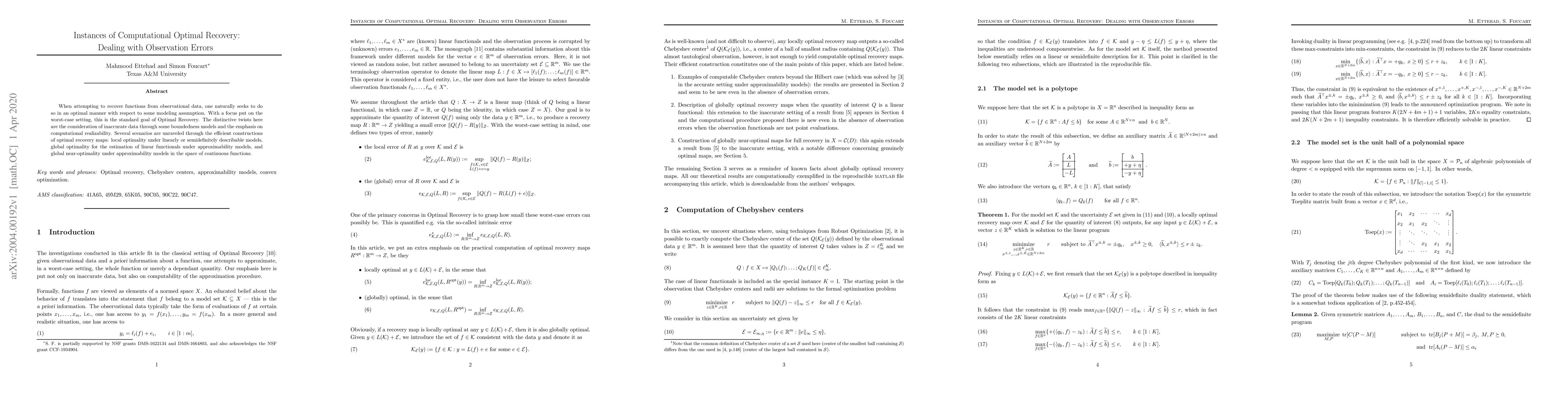 This paper explores computational optimal recovery methods for recovering functions from observational data, focusing on handling inaccuracies through boundedness models. It presents efficient constructions for local, global, and near-global optimality under various modeling assumptions.
