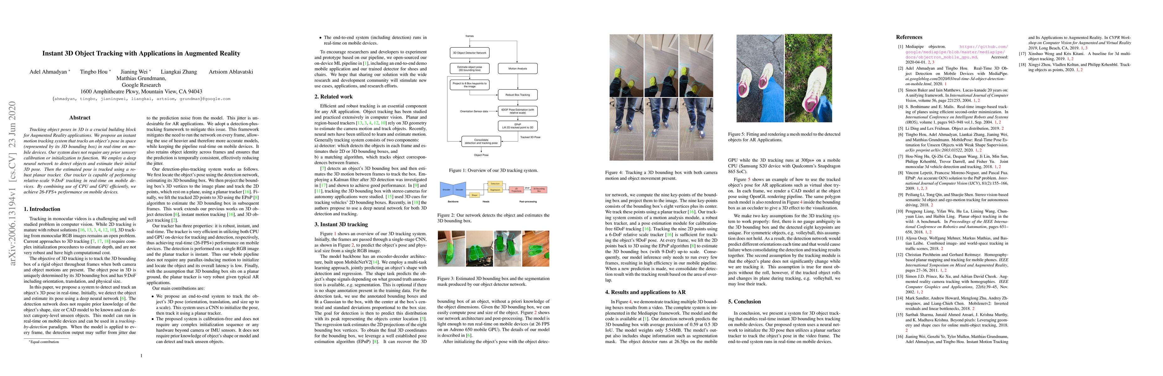 This paper proposes an instant 3D object tracking system for real-time augmented reality applications on mobile devices, utilizing a deep neural network for initial pose estimation and a robust planar tracker for real-time 9-DoF tracking without prior calibration, achieving over 26 FPS performance.