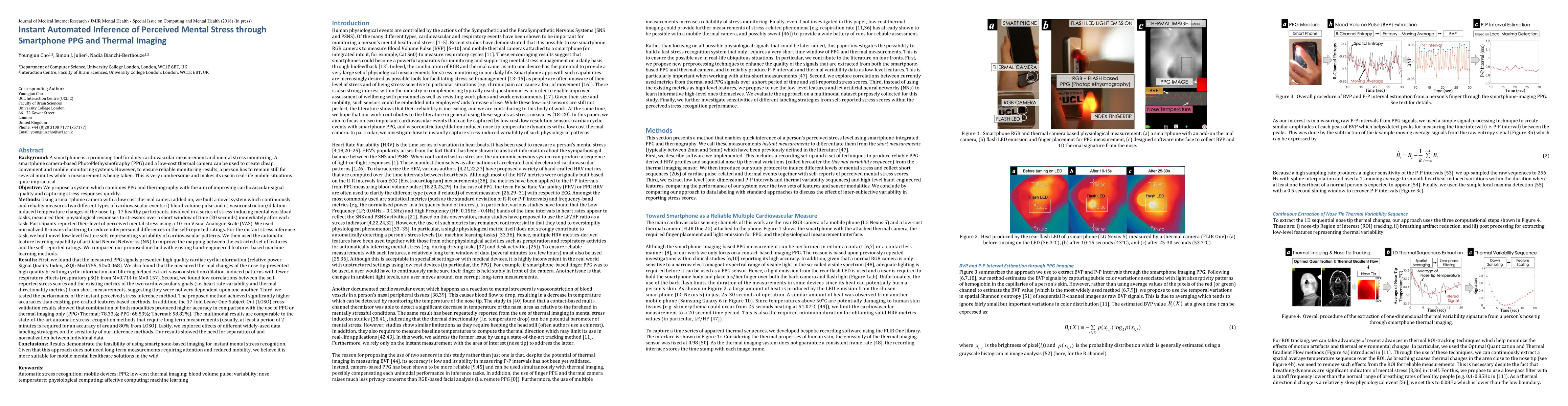 This research proposes a novel system combining smartphone PPG and thermal imaging to instantly infer perceived mental stress. The system measures blood volume pulse and temperature changes via a smartphone camera and thermal camera, respectively, in a 20-second window post-stress tasks. Using neural networks for feature learning, the system aims to improve cardiovascular signal quality and stress response detection, outperforming traditional hand-engineered feature methods.
