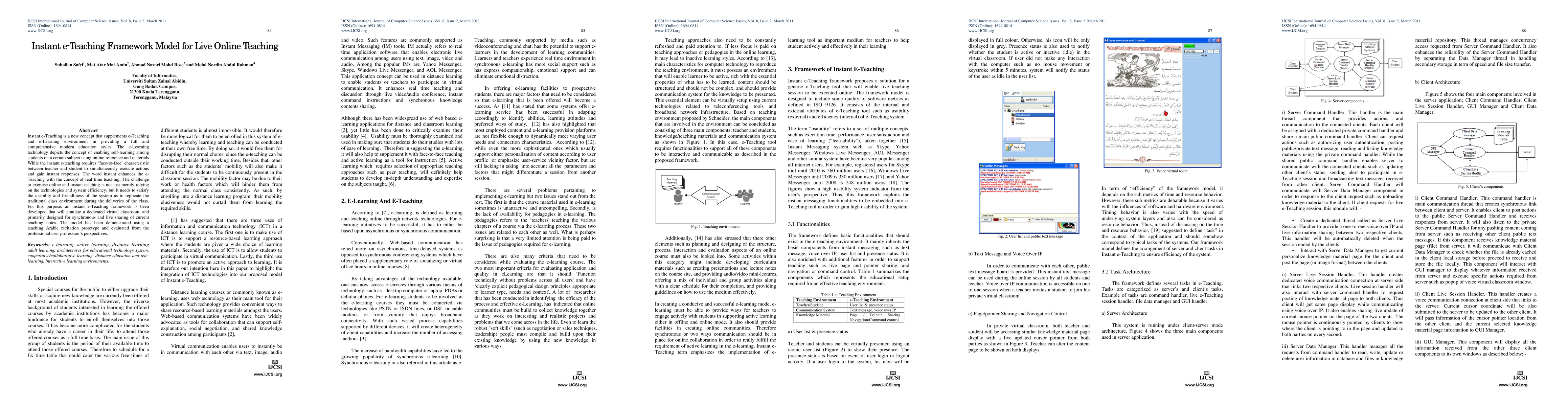 Researchers developed an instant e-teaching framework to replicate traditional classroom environments online, focusing on usability and real-time interaction between teachers and students. The model is designed for synchronous live sharing of teaching notes and has been tested with a teaching Arabic recitation prototype.