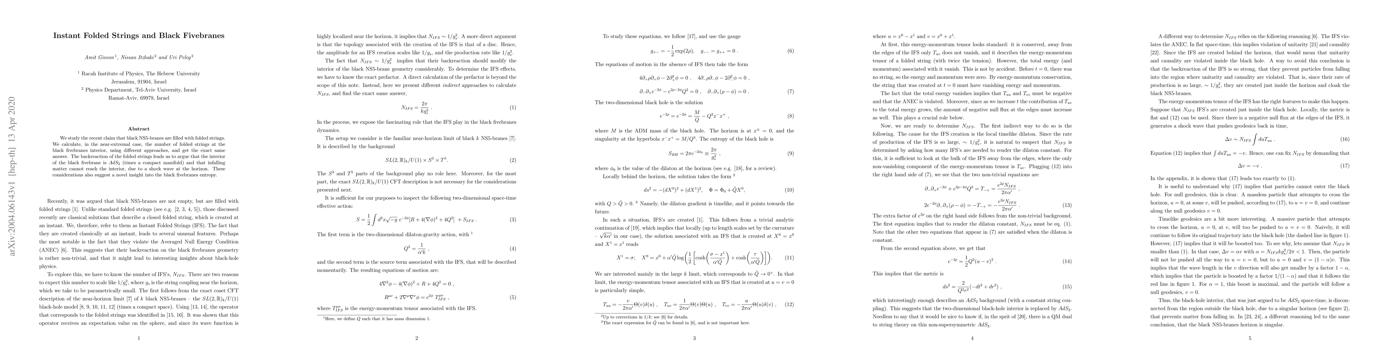 We study the recent claim that black NS5-branes are filled with folded strings. We calculate, in the near-extremal case, the number of folded strings at the black fivebranes interior, using different approaches, and get the exact same answer. The backreaction of the folded strings leads us to argue that the interior of the black fivebrane is AdS_2 (times a compact manifold) and that infalling matter cannot reach the interior, due to a shock wave at the horizon. These considerations also suggest a novel insight into the black fivebranes entropy.