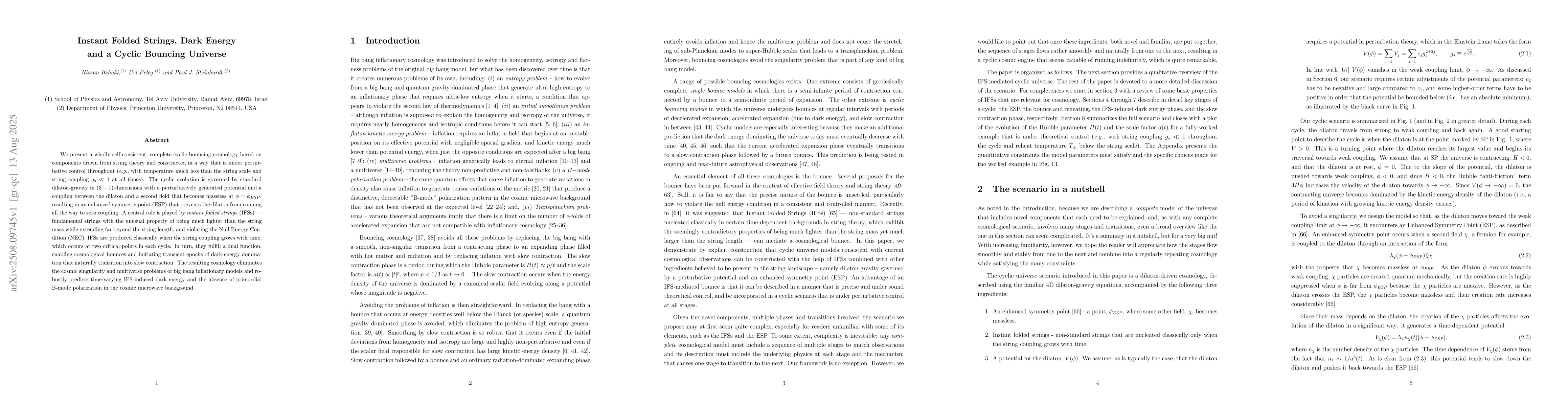 We present a wholly self-consistent, complete cyclic bouncing cosmology based on components drawn from string theory and constructed in a way that is under perturbative control throughout (e.g., with temperature much less than the string scale and string coupling $g_s \ll 1$ at all times). The cyclic evolution is governed by standard dilaton-gravity in $(3+1)$-dimensions with a perturbatively generated potential and a coupling between the dilaton and a second field that becomes massless at $\phi= \phi_{ESP}$, resulting in an enhanced symmetry point (ESP) that prevents the dilaton from running all the way to zero coupling. A central role is played by instant folded strings (IFSs) - fundamental strings with the unusual property of being much lighter than the string mass while extending far beyond the string length, and violating the Null Energy Condition (NEC). IFSs are produced classically when the string coupling grows with time, which occurs at two critical points in each cycle. In turn, they fulfill a dual function: enabling cosmological bounces and initiating transient epochs of dark-energy domination that naturally transition into slow contraction. The resulting cosmology eliminates the cosmic singularity and multiverse problems of big bang inflationary models and robustly predicts time-varying IFS-induced dark energy and the absence of primordial B-mode polarization in the cosmic microwave background.