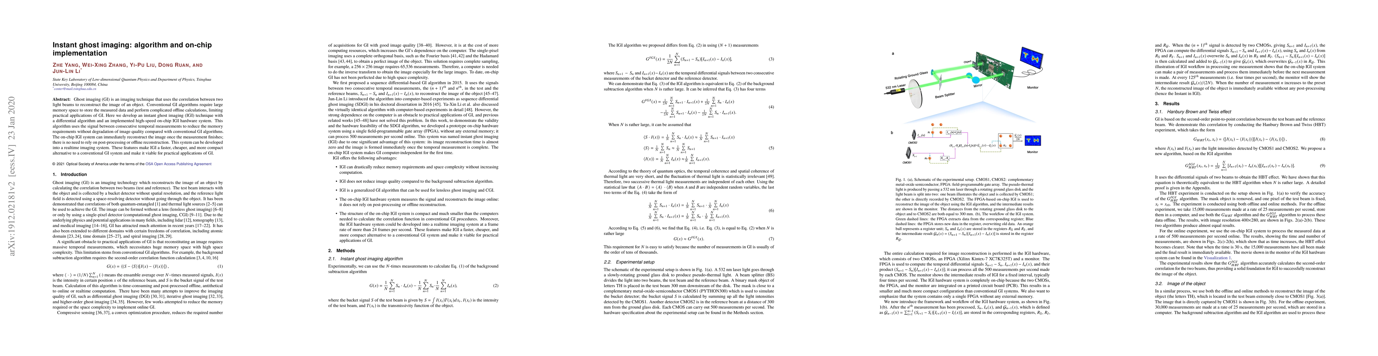 This paper introduces an instant ghost imaging (IGI) technique with a differential algorithm and an on-chip hardware system that reconstructs images in real time without the need for offline processing. The proposed method significantly reduces memory requirements and computational complexity compared to conventional ghost imaging, making it a faster, cheaper, and more compact alternative for practical applications.