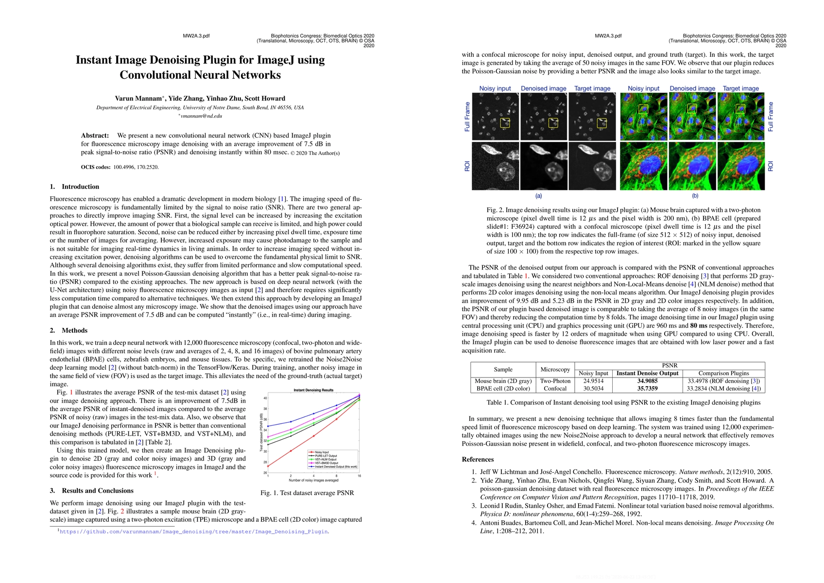 This research introduces a CNN-based ImageJ plugin that effectively denoises fluorescence microscopy images, achieving a 7.5 dB improvement in PSNR with instant processing within 80 milliseconds.