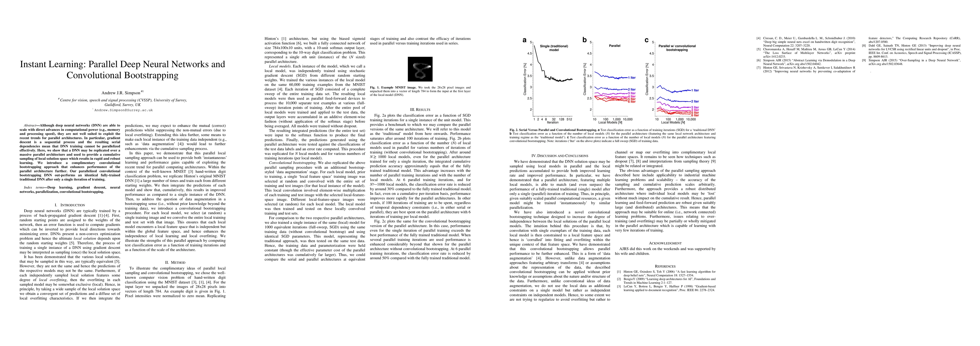 Although deep neural networks (DNN) are able to scale with direct advances in computational power (e.g., memory and processing speed), they are not well suited to exploit the recent trends for parallel architectures. In particular, gradient descent is a sequential process and the resulting serial dependencies mean that DNN training cannot be parallelized effectively. Here, we show that a DNN may be replicated over a massive parallel architecture and used to provide a cumulative sampling of local solution space which results in rapid and robust learning. We introduce a complimentary convolutional bootstrapping approach that enhances performance of the parallel architecture further. Our parallelized convolutional bootstrapping DNN out-performs an identical fully-trained traditional DNN after only a single iteration of training.