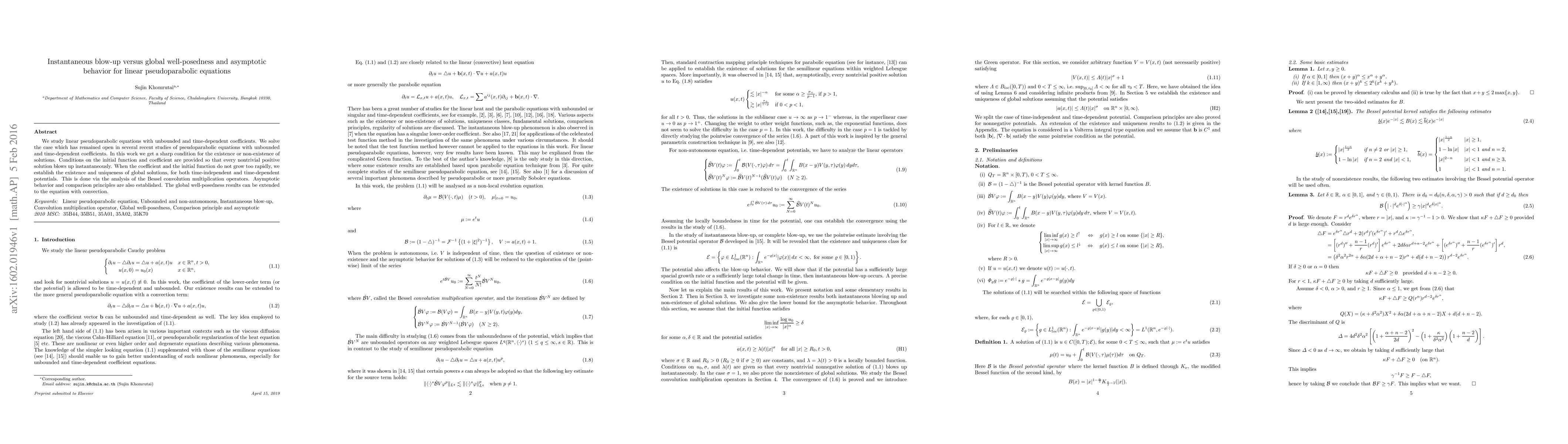 We study linear pseudoparabolic equations with unbounded and time-dependent coefficients. We solve the case which has remained open in several recent studies of pseudoparabolic equations with unbounded and time-dependent coefficients. In this work we get a sharp condition for the existence or non-existence of solutions. Conditions on the initial function and coefficient are provided so that every nontrivial positive solution blows up instantaneously. When the coefficient and the initial function do not grow too rapidly, we establish the existence and uniqueness of global solutions, for both time-independent and time-dependent potentials. This is done via the analysis of the Bessel convolution multiplication operators. Asymptotic behavior and comparison principles are also established. The global well-posedness results can be extended to the equation with convection.
