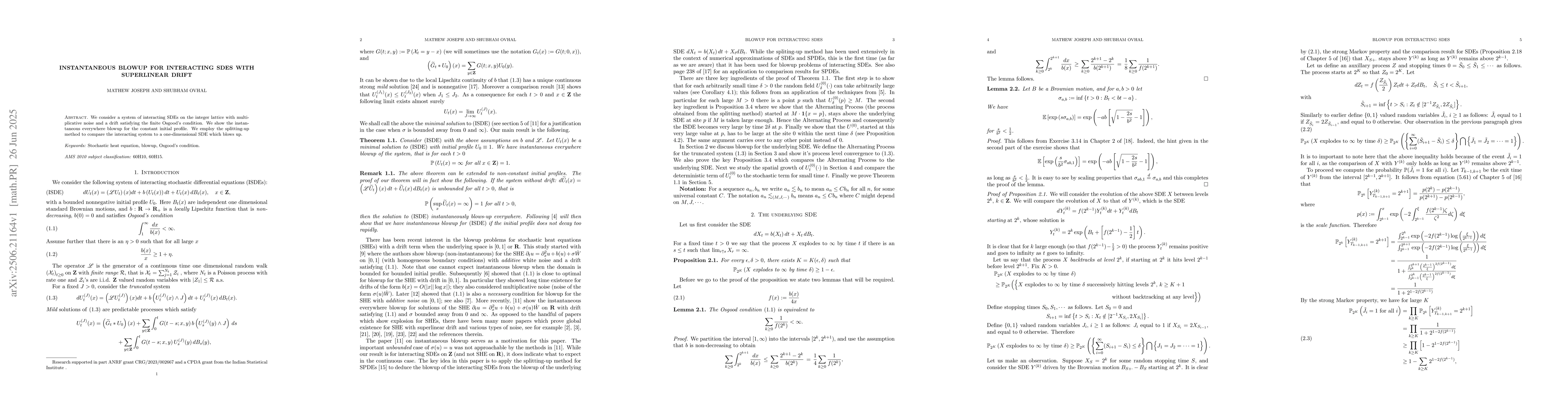The paper introduces a novel comparison technique using splitting-up methods and detailed probabilistic bounds to analyze instantaneous blowup in interacting stochastic systems.