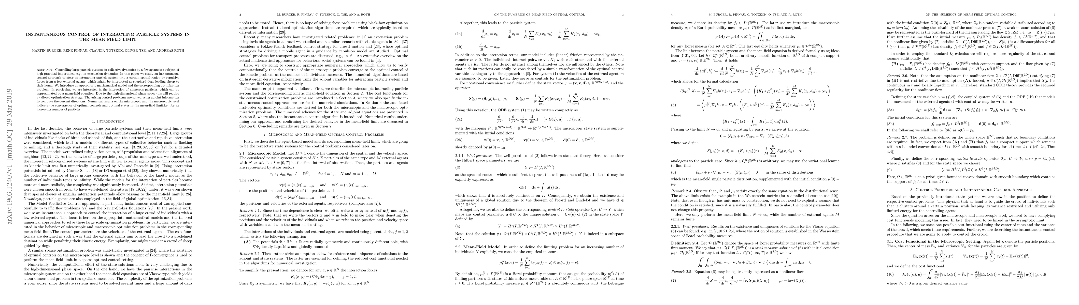 Controlling large particle systems in collective dynamics by a few agents is a subject of high practical importance, e.g., in evacuation dynamics. In this paper we study an instantaneous control approach to steer an interacting particle system into a certain spatial region by repulsive forces from a few external agents, which might be interpreted as shepherd dogs leading sheep to their home. We introduce an appropriate mathematical model and the corresponding optimization problem. In particular, we are interested in the interaction of numerous particles, which can be approximated by a mean-field equation. Due to the high-dimensional phase space this will require a tailored optimization strategy. The arising control problems are solved using adjoint information to compute the descent directions. Numerical results on the microscopic and the macroscopic level indicate the convergence of optimal controls and optimal states in the mean-field limit,i.e., for an increasing number of particles.