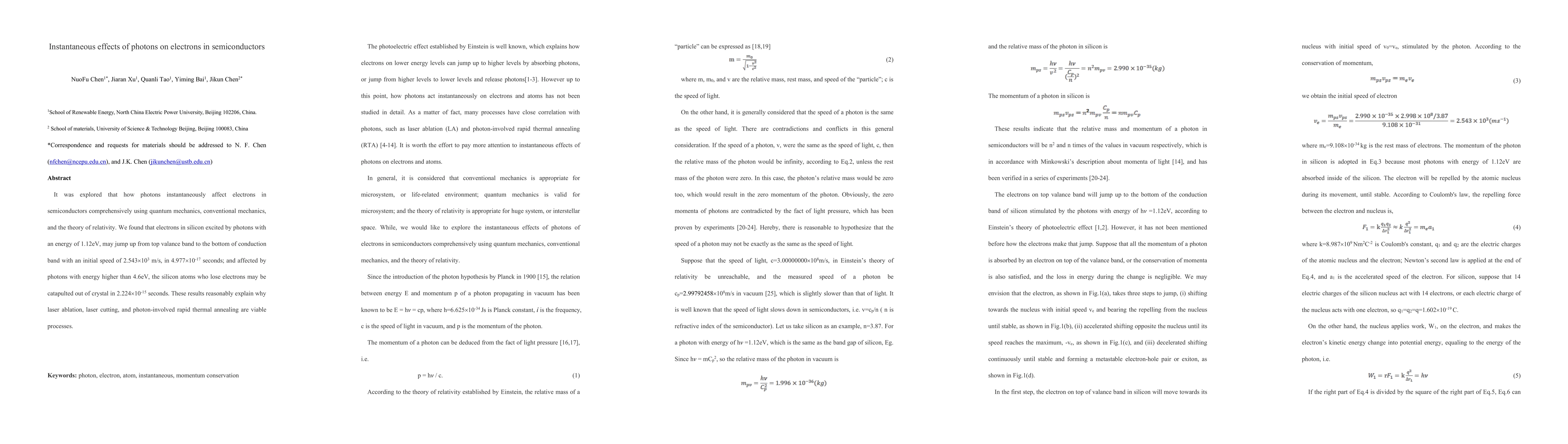 This paper investigates the instantaneous effects of photons on electrons in semiconductors, revealing that photons transfer energy and momentum to electrons, causing them to jump energy levels. Key findings include photons having rest masses in vacuum and silicon, and the rapid electron excitation and atom ejection times in silicon under specific photon energies.