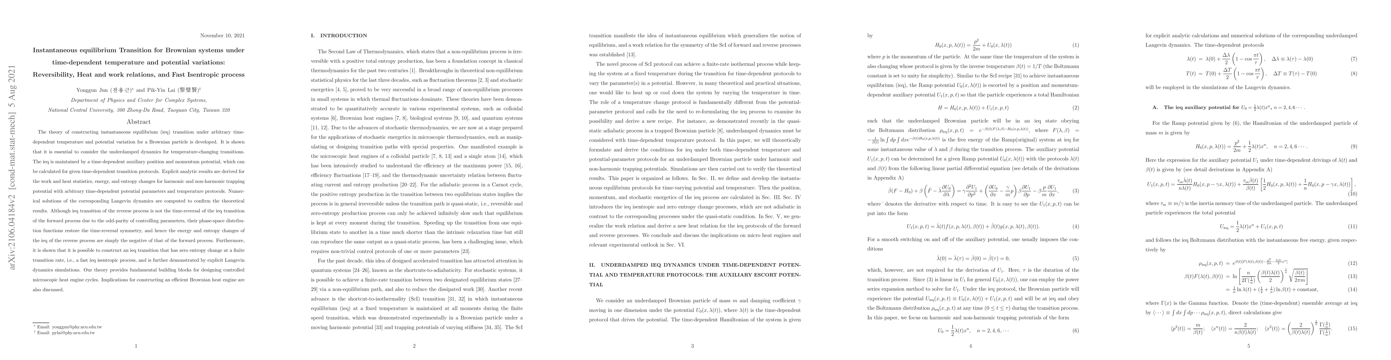 This paper develops a theory for instantaneous equilibrium transitions in Brownian systems under time-dependent temperature and potential variations, showing that underdamped dynamics are crucial. The study derives analytic results for work, heat, energy, and entropy changes, confirming the theoretical results with numerical simulations and demonstrating the possibility of fast isentropic processes.