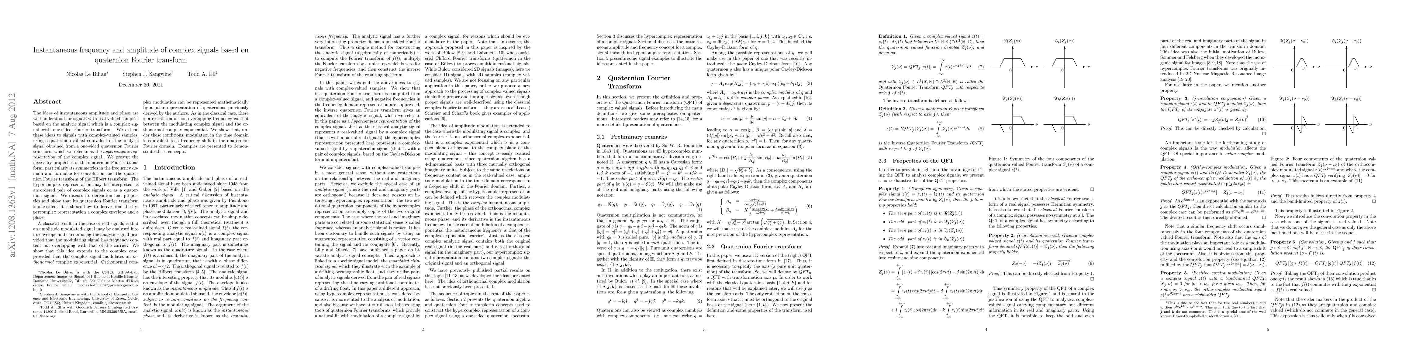 The paper introduces a quaternion hypercomplex representation for complex signals, enabling the computation of instantaneous amplitude and phase, and demonstrates how time-domain modulation translates to frequency shifts in the quaternion Fourier domain.