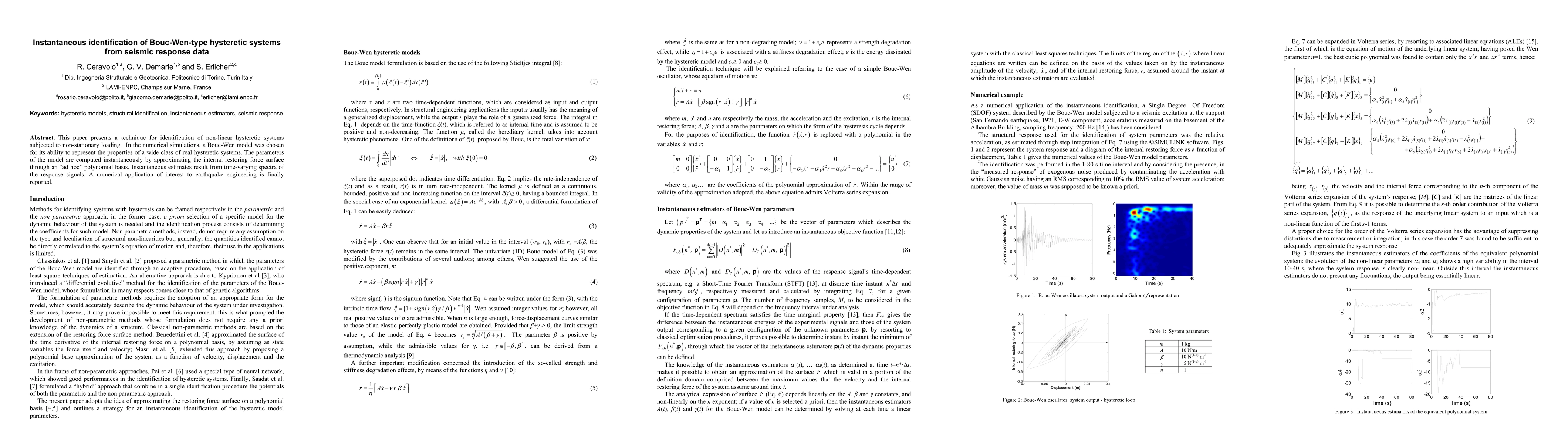 A new technique identifies non-linear hysteretic systems from seismic response data by approximating the internal restoring force surface with an ad hoc polynomial basis, allowing for instantaneous estimation of model parameters.