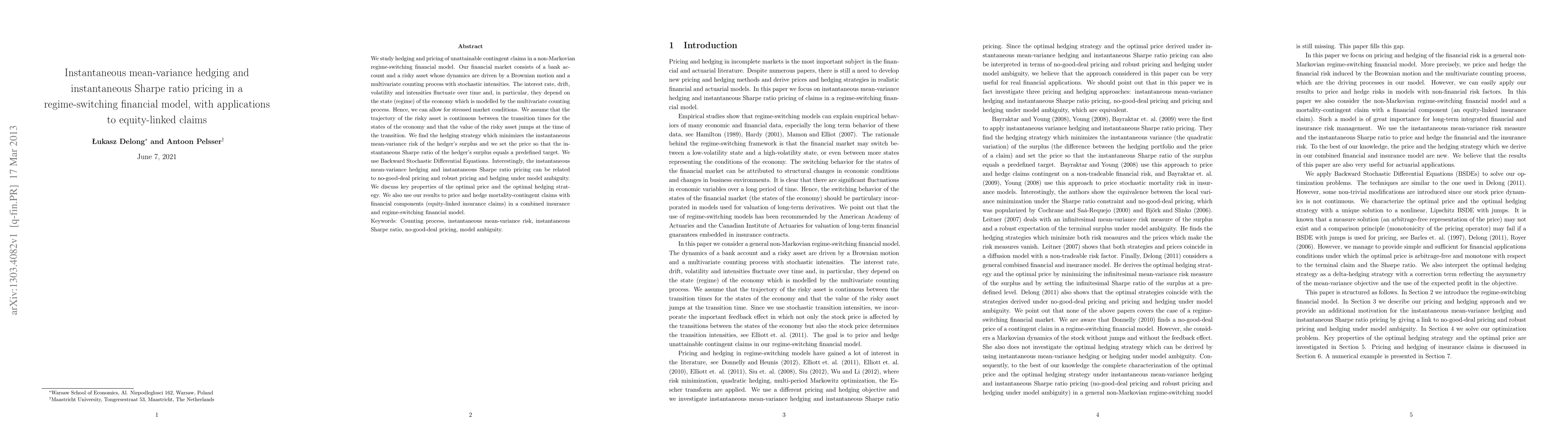 This paper develops a regime-switching financial model for instantaneous mean-variance hedging and pricing of equity-linked insurance claims. It uses Backward Stochastic Differential Equations to find the optimal hedging strategy and pricing that aligns with the instantaneous Sharpe ratio, addressing model ambiguity and no-good-deal principles.