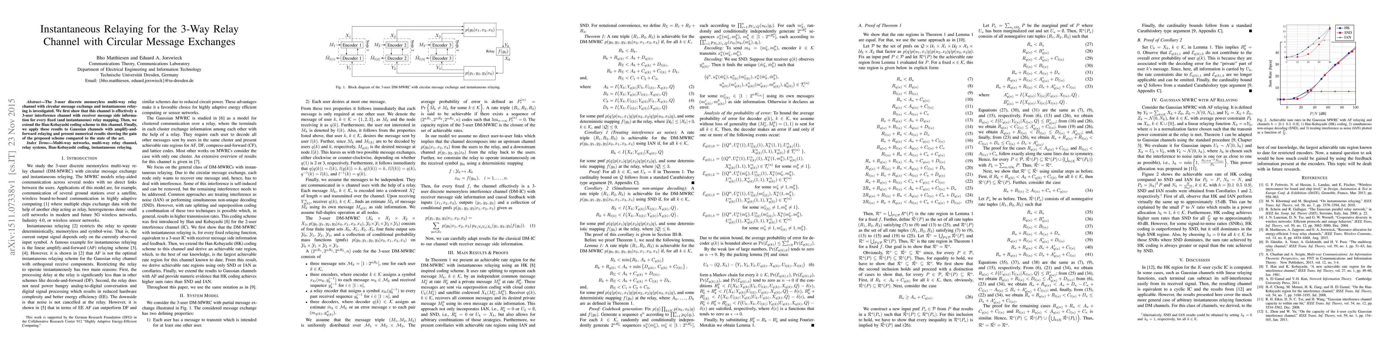 This paper investigates the 3-user relay channel with circular message exchanges and instantaneous relaying, demonstrating it as a 3-user interference channel with receiver side information. It extends the Han-Kobayashi coding scheme to this context and applies it to Gaussian channels, showing improved performance over existing methods.